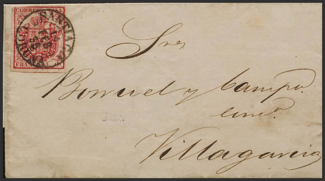 33. 1854. 4 cuartos rojo. SANTIAGO a VILLAGARCIA. Matasello SANTIAGO / CORUÑA. MAGNIFICA Y RARA CARTA CON EL SELLO INUTILIZADO CON FECHADOR. Edifil 2018: 500 Euros