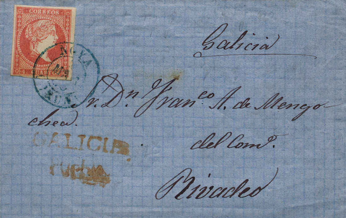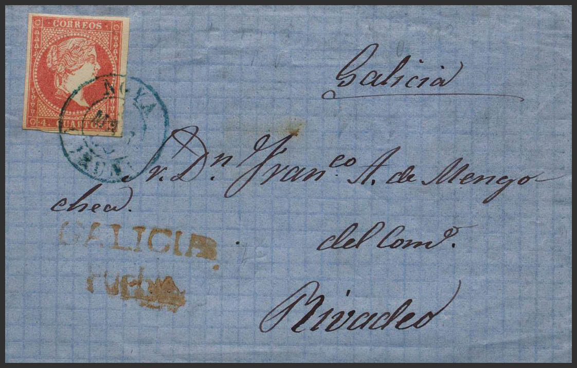 48. 1855. 4 cuartos rojo. NOYA (LA CORUÑA) a RIVADEO. Matasello NOYA / CORUÑA (Tipo I), en azul y en el frente marca prefilatélica GALICIA / PUEBLA, en rojo. MAGNIFICA.