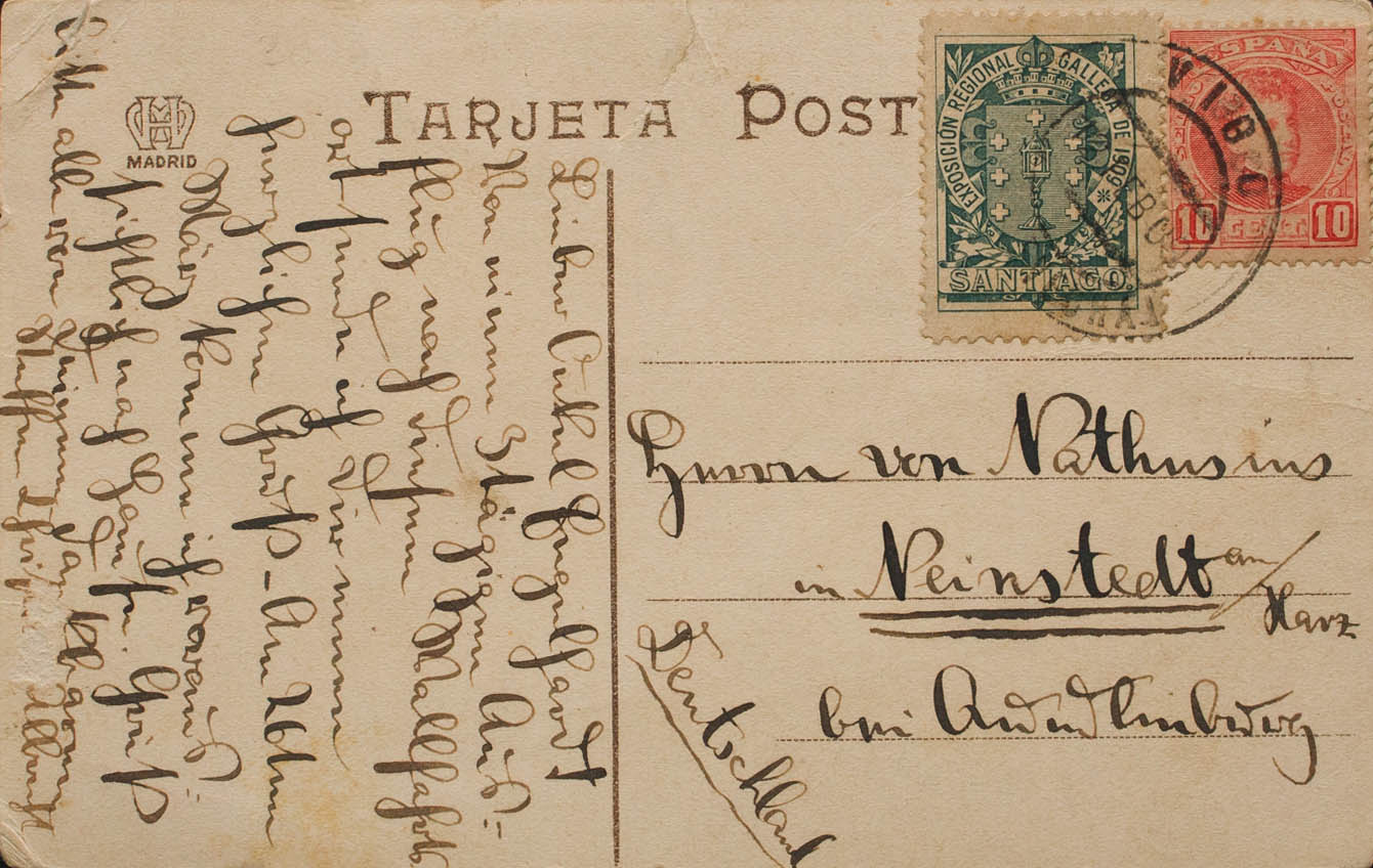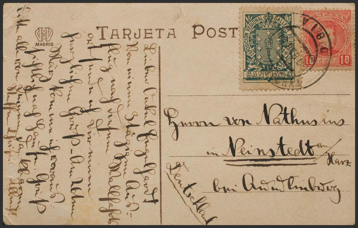 243. 1909. 10 cts rojo y viñeta EXPOSICION REGIONAL GALLEGA DE 1909 SANTIAGO. Tarjeta Postal de VIGO a NEINSTEDT (ALEMANIA). MAGNIFICA Y RARISIMA.