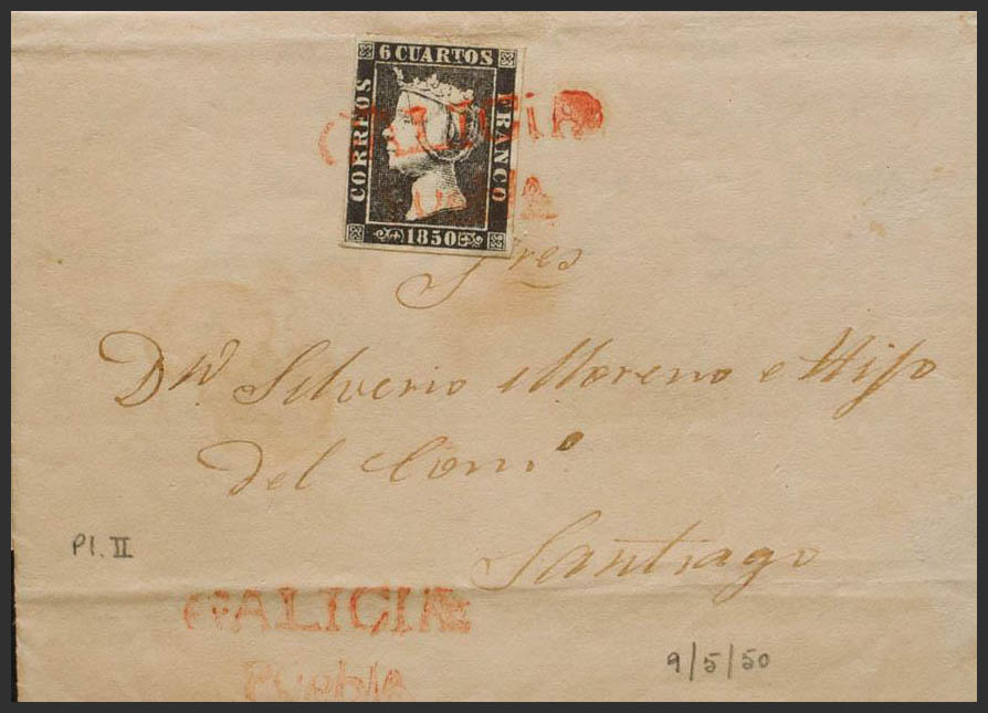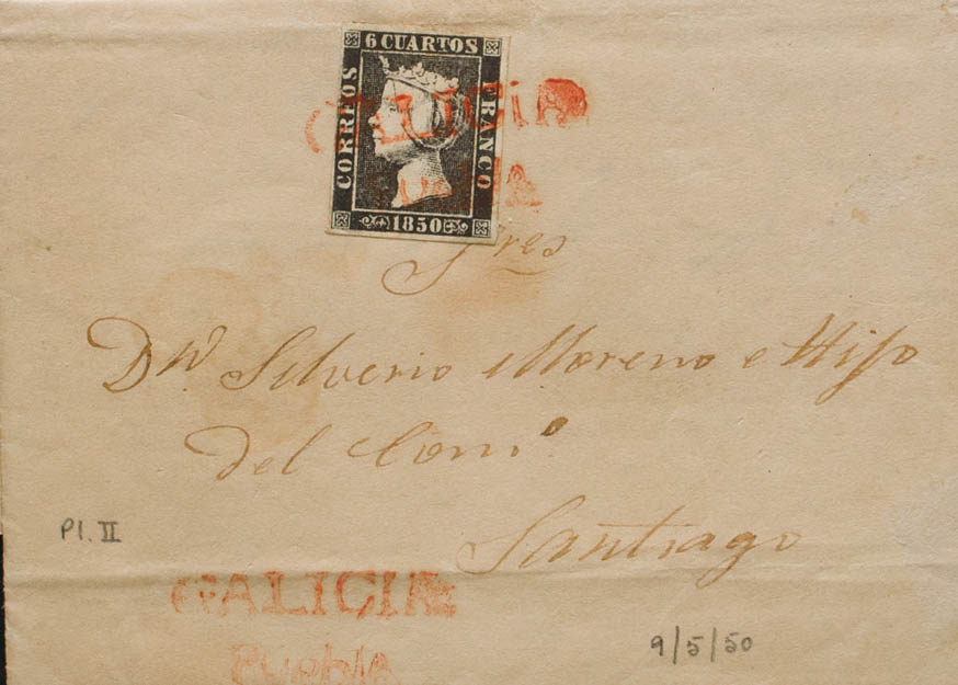 1A. 1850. 6 cuartos negro. PUEBLA DE CARAMIÑAL a SANTIAGO. Matasello prefilatélico GALICIA / PUEBLA, en rojo. MAGNIFICA Y RARA. Cert. COMEX.
