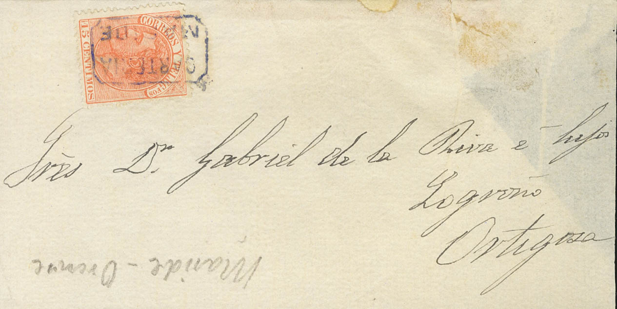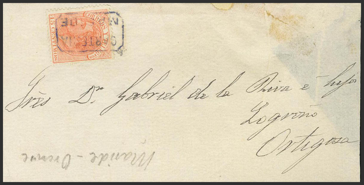210. (1882ca). 15 cts naranja. MASIDE (ORENSE) a ORTIGOSA DE CAMEROS. Matasello CARTERIA / MASIDE, en azul. MAGNIFICA.