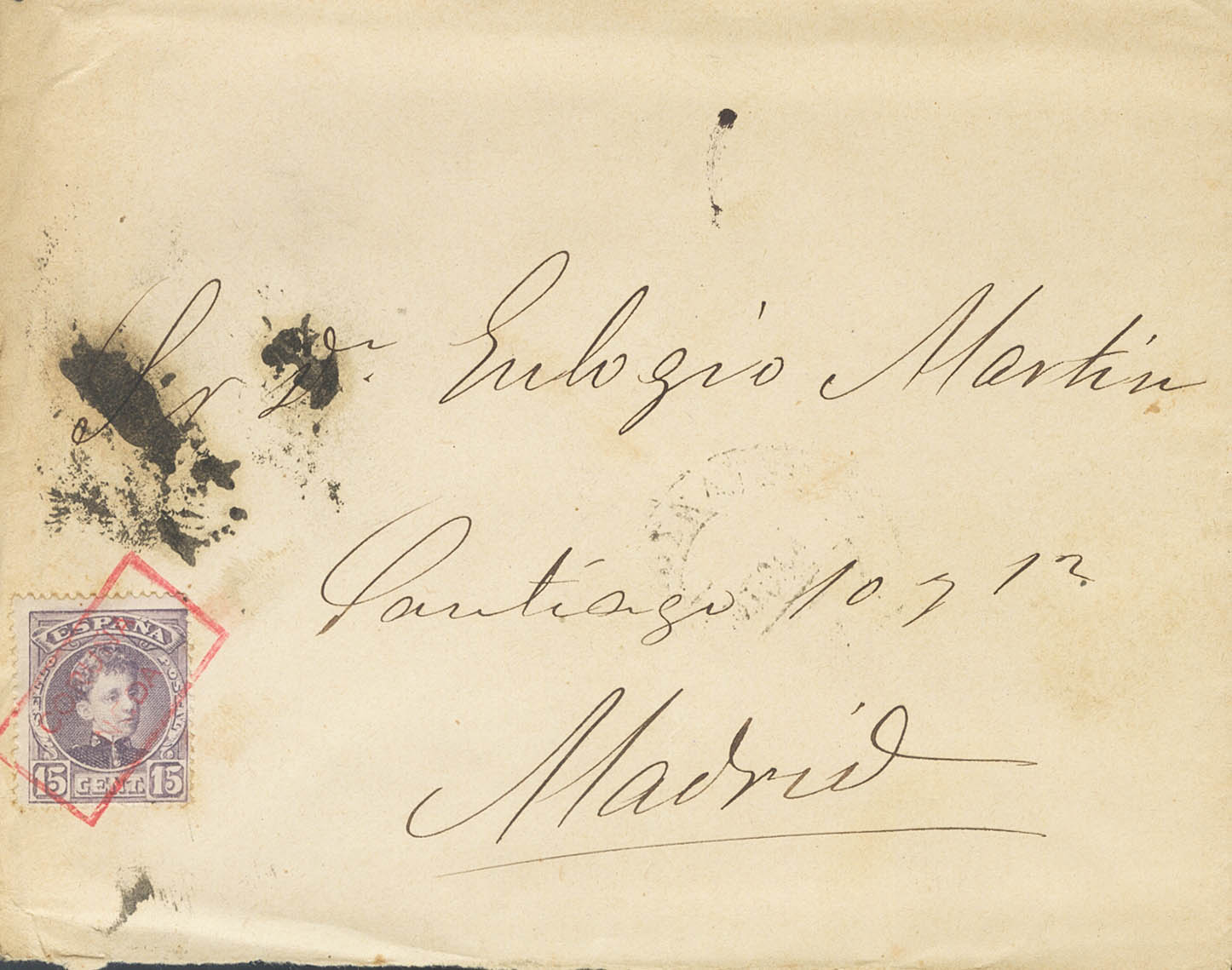 245. 1903. 15 cts lila castaño. NEDA a MADRID. Matasello carterÃa especial CORUÑA / NEDA, en rojo. MAGNIFICA Y RARISIMA, NO RESEÑADA EN ESTE COLOR.