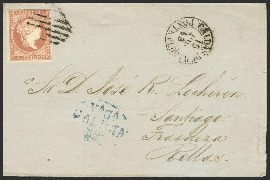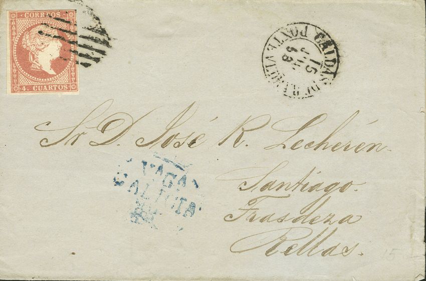 48. 1858. 4 cuartos rojo. CALDAS a RELLAS. Matasello PARRILLA, al lado marca prefilatélica Vª Gª / GALICIA, en azul. BONITA.