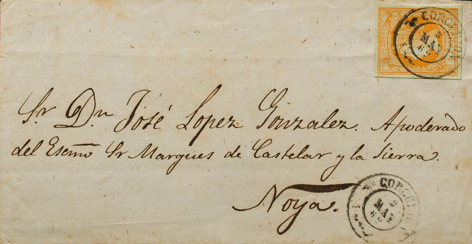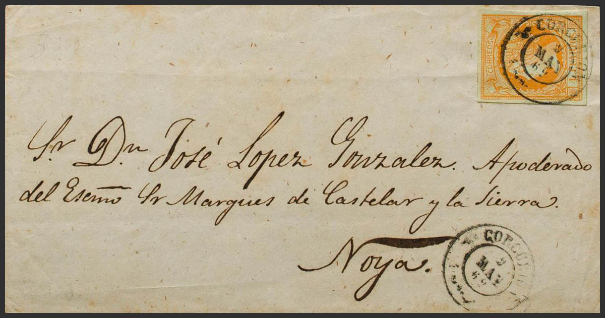 52. 1862. 4 cuartos naranja. Frontal de CORCUBION a NOYA. Matasello CORCUBION / CORUÑA. MAGNIFICA.