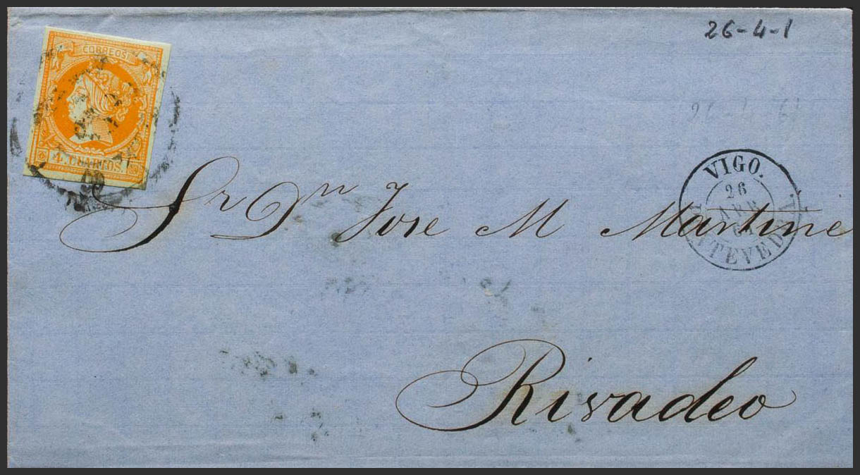 52. 1861. 4 cuartos naranja. VIGO a RIBADEO. Matasello R.CARRETA Nº60. MAGNIFICA.