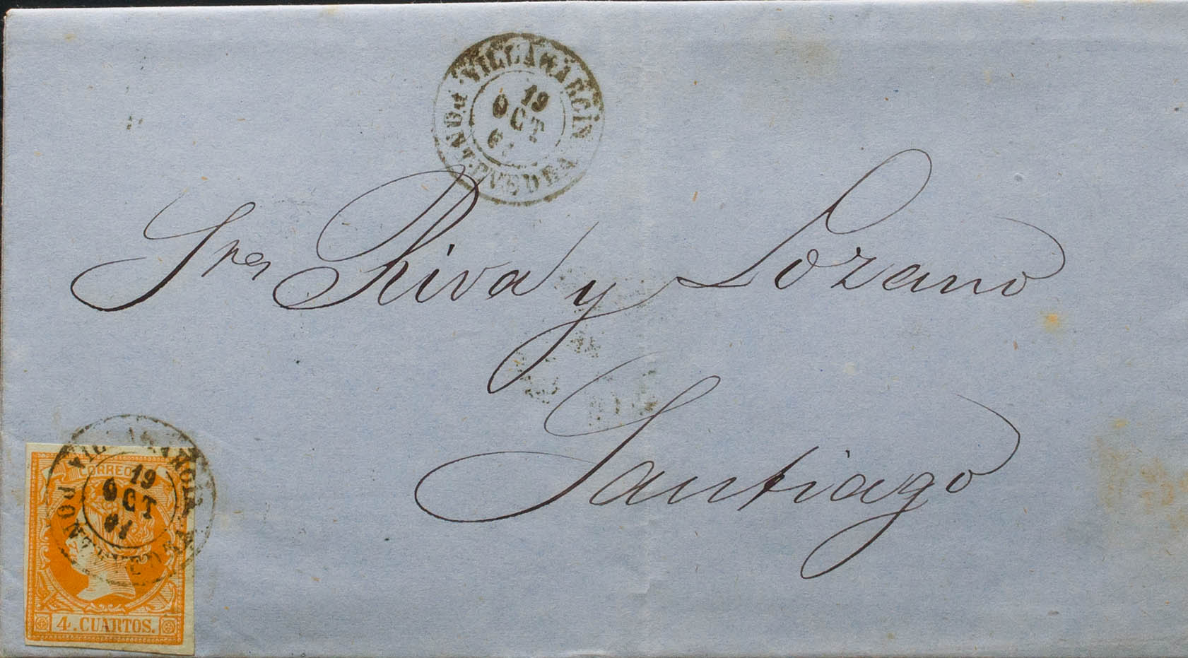 52. 1861. 4 cuartos naranja. VILLAGARCIA a SANTIAGO. Matasello VILLAGARCIA / PONTEVEDRA. MAGNIFICA.