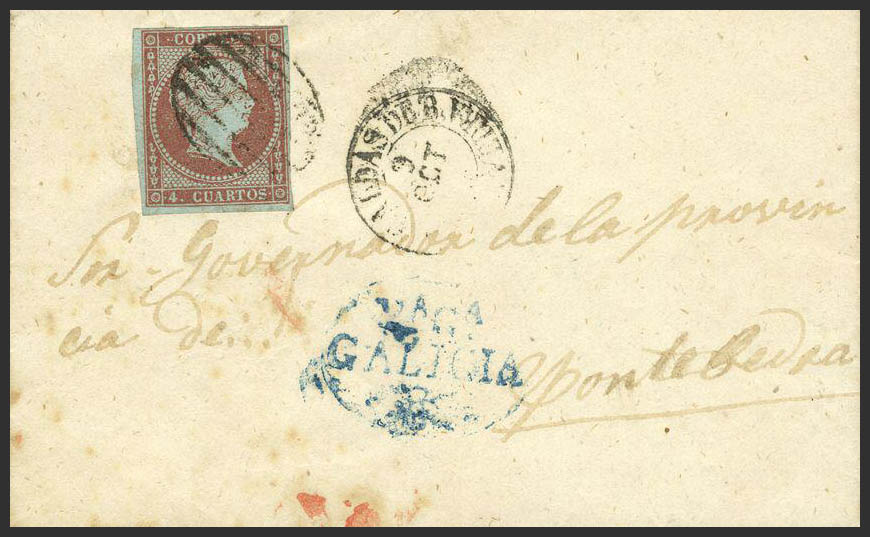40. 1856. 4 cuartos rojo. CALDAS a PONTEVEDRA. Matasello PARRILLA, marca prefilatélica Vª Gª / GALICIA.