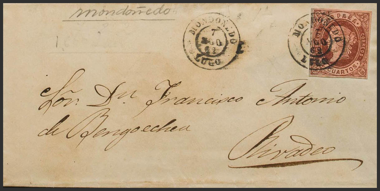 58. 1862. 4 cuartos castaño. MONDOÑEDO a RIBADEO. Matasello MONDOÑEDO / LUGO. MAGNIFICA Y RARA.