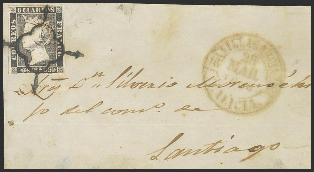 1. 1850. 6 cuartos negro. Frontal de VILLAGARCIA a SANTIAGO. En el frente baeza VILLAGARCIA / GALICIA, en verde. MAGNIFICO E INUSUAL.
