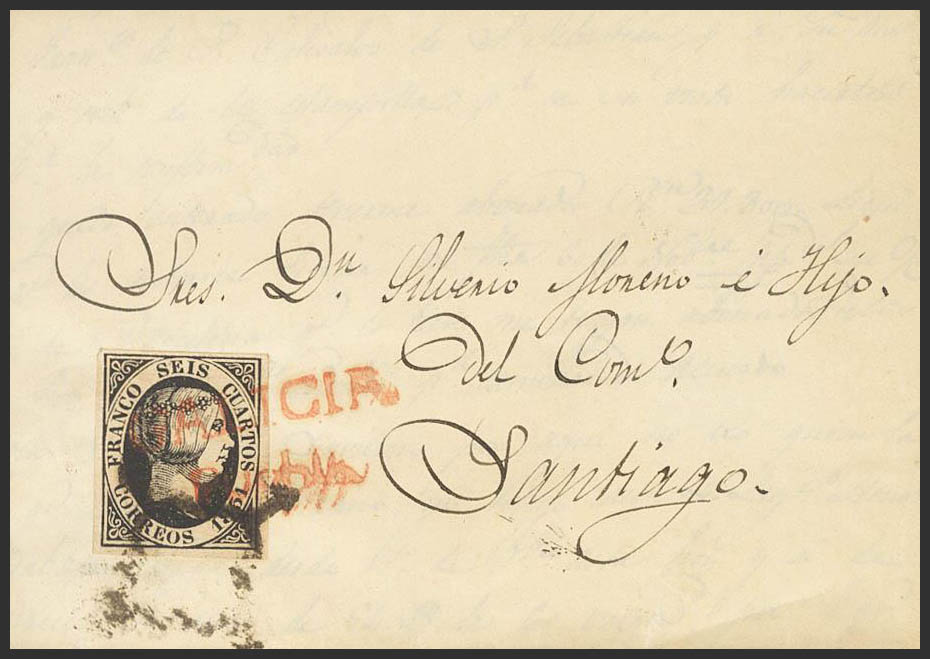 6. 1851. 6 cuartos negro. PUEBLA DEL CARAMIÑAL a SANTIAGO. Matasello mixto ARAÑA, en negro y prefilatélico GALICIA / PUEBLA, en rojo. MAGNIFICA.