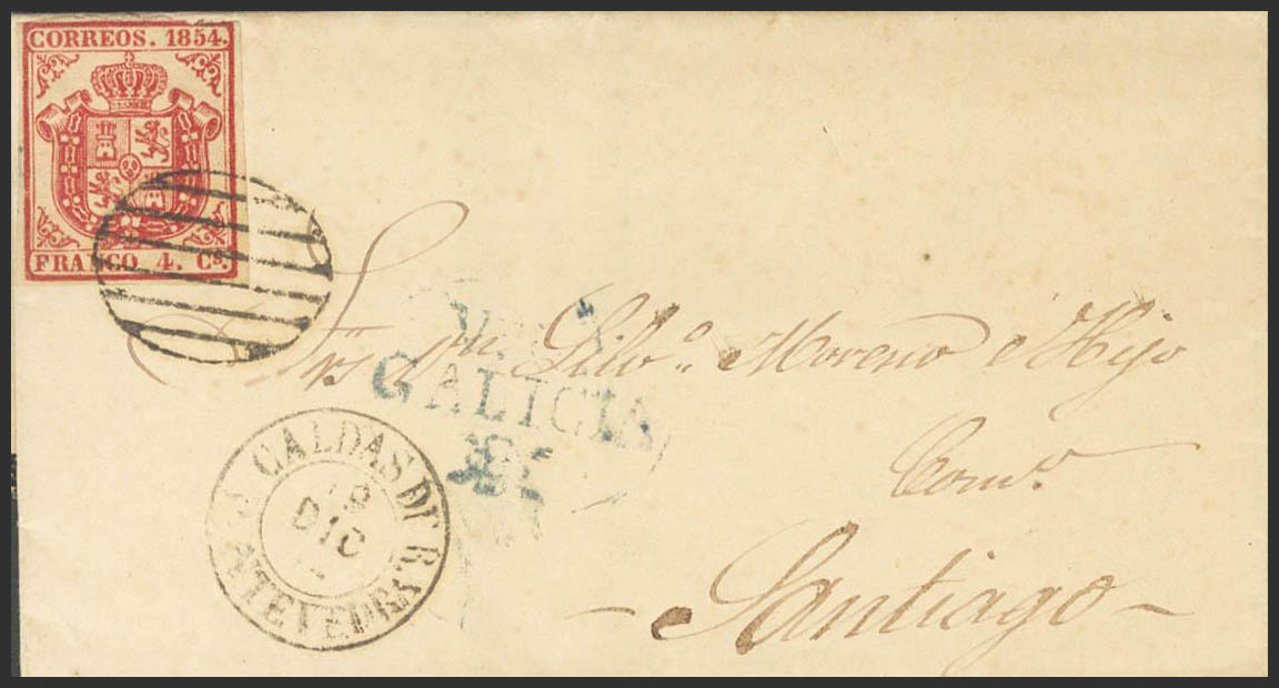 33. 1854. 4 cuartos carmÃn. VILLAGARCIA DE AROSA a SANTIAGO DE COMPOSTELA. En el frente marca prefilatélica Vª Gª / GALICIA, en azul. MAGNIFICA Y RARA.