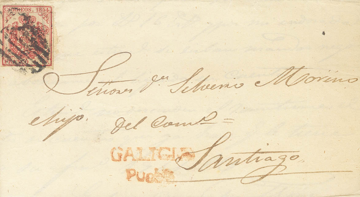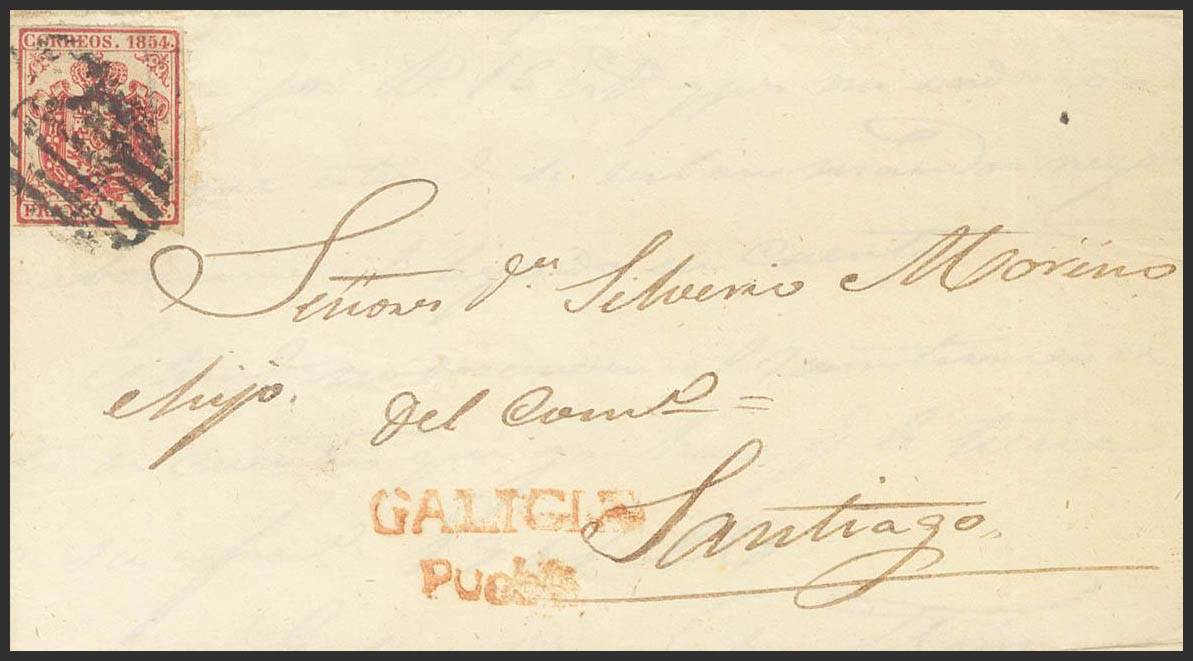 33. 1854. 4 cuartos carmÃn. PALMEIRA (LA CORUÑA) a SANTIAGO. En el frente marca prefilatélica GALICIA / PUEBLA, en rojo. MAGNIFICA.