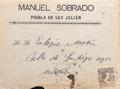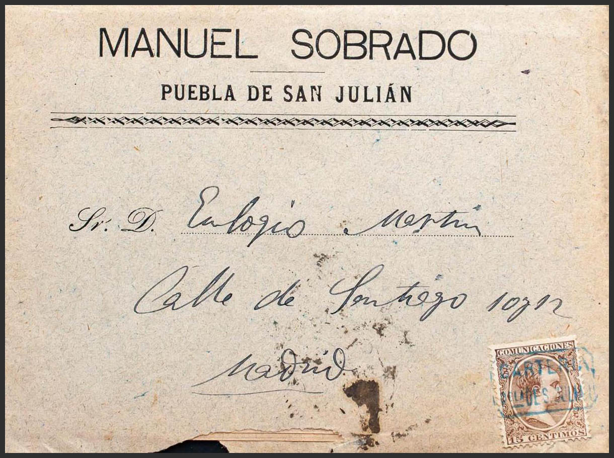 219. 1898. 15 cts castaño violeta. PUEBLA DE SAN JULIAN (LUGO) a MADRID (rasgada por apertura en la parte inferior). Matasello CARTERIA / PBLA DE S.JULIAN, en azul. BONITA Y RARA.