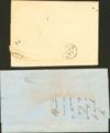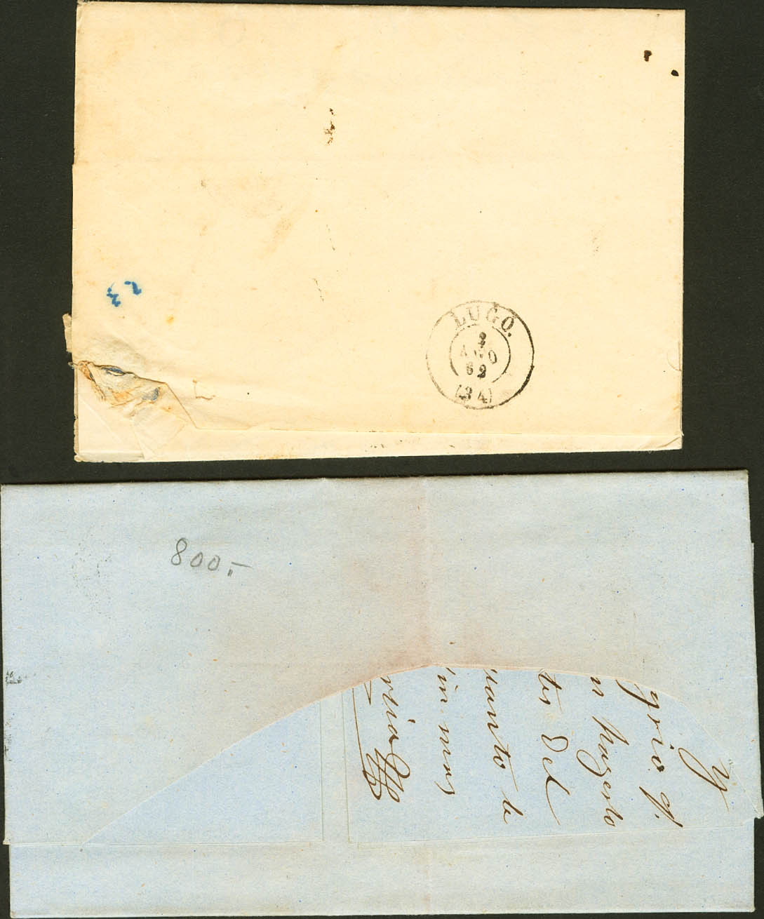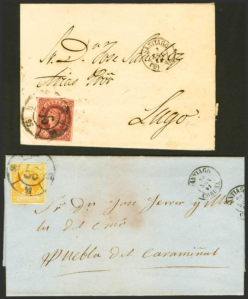52, 58. 1860. Conjunto de dos cartas circuladas con los sellos de 4 cuartos amarillo y castaño de SANTIAGO DE COMPOSTELA a LUGO y PUEBLA, respectivamente e inutilizados con el matasello R.CARRETA Nº56, de Santiago. MAGNIFICAS.