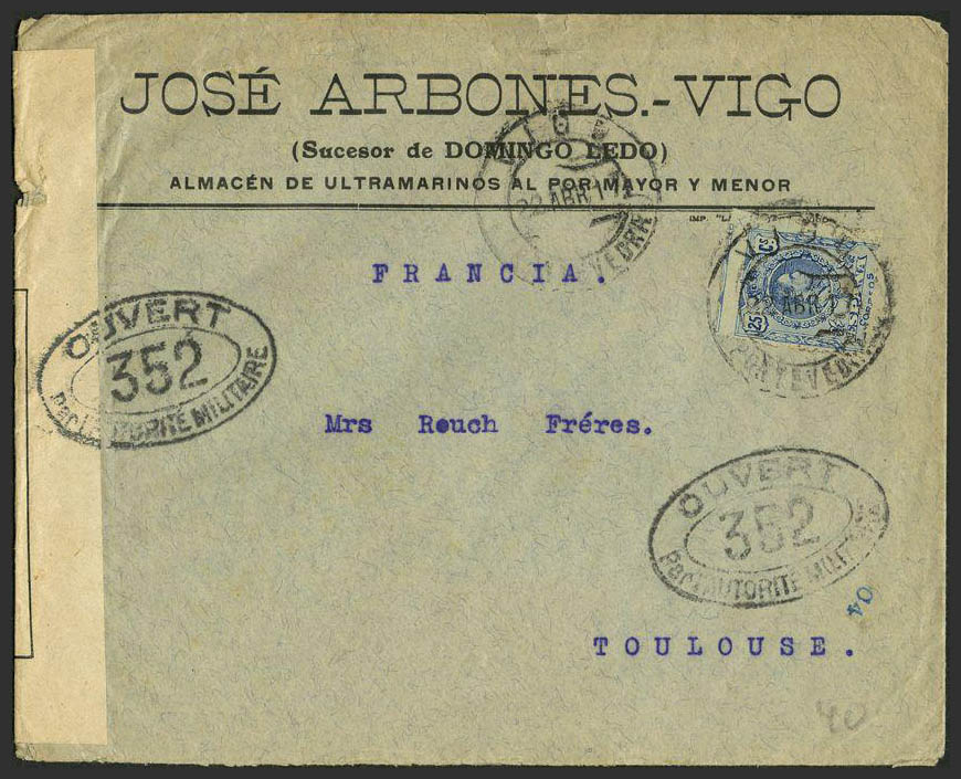 274. 1917. 25 cts. azul. VIGO a TOULOUSE (FRANCIA). Matasello VIGO / (PONTEVEDRA), en el frente marca OUVERT / PAR AUTORITE MILITAIRE / 352. MAGNIFICA.