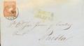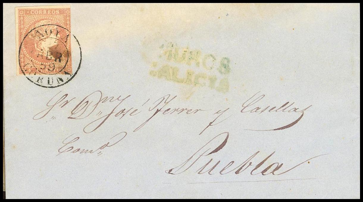 48. 1859. 4 cuartos rojo. NOYA a PUEBLA. Matasello NOYA / CORUÑA (Tipo I), en el frente marca prefilatélica MUROS / GALICIA, en verde-azul. MAGNIFICA.