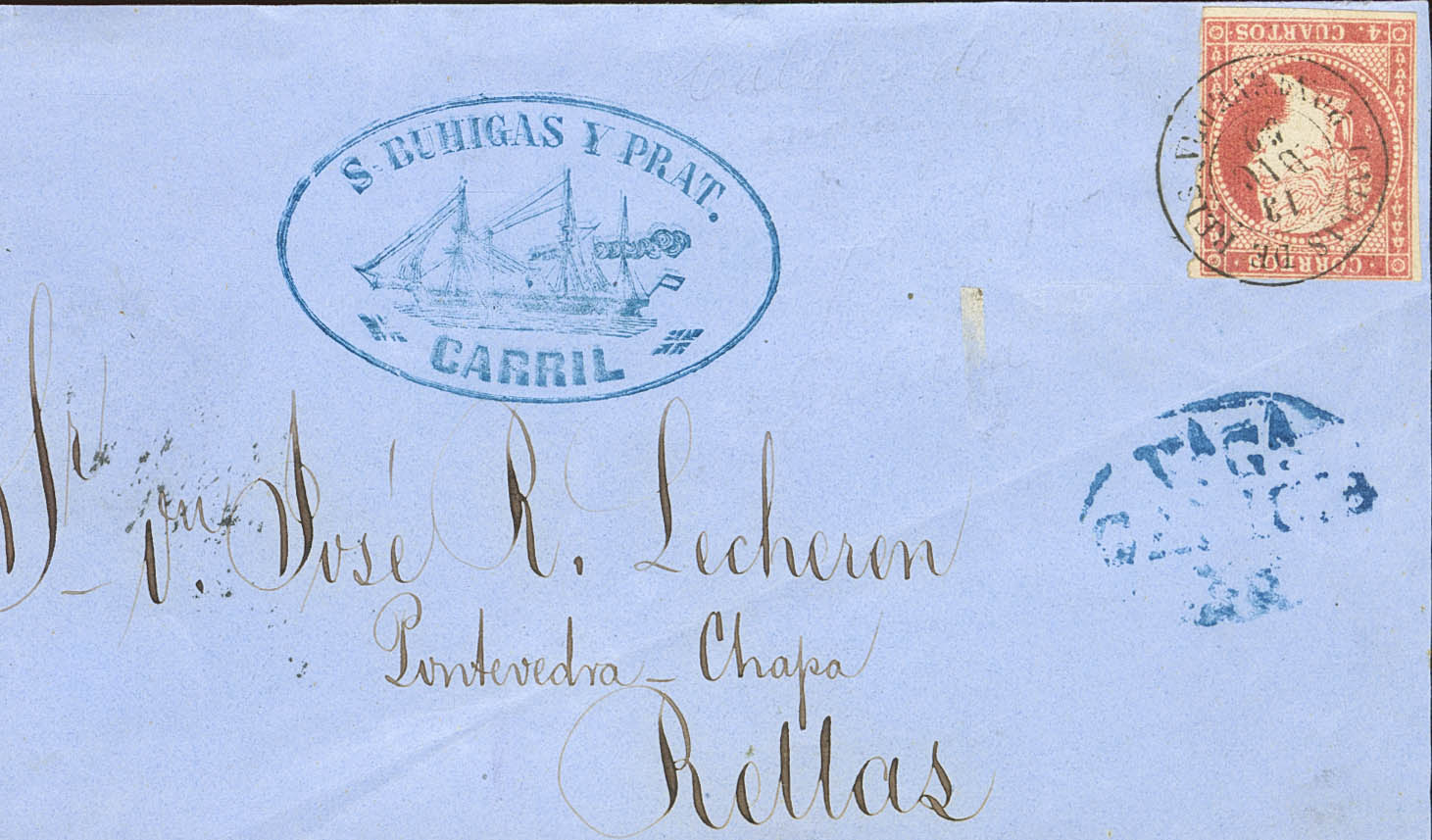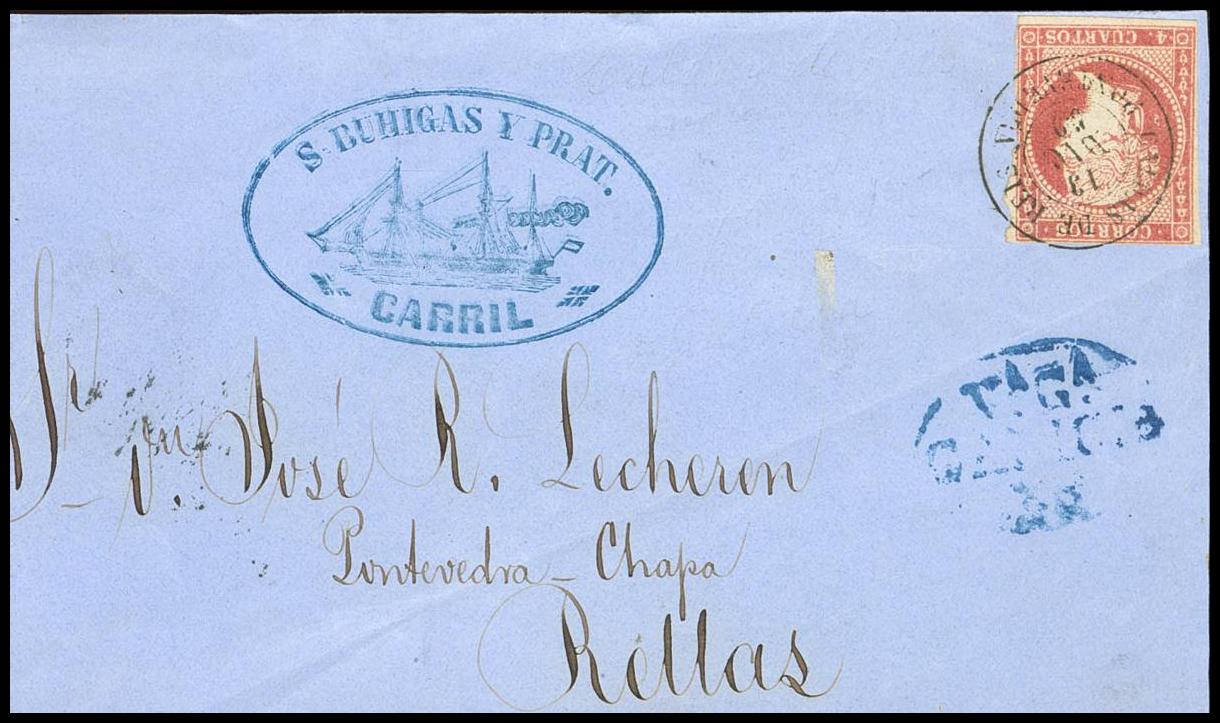 48. 1859. 4 cuartos rojo. Frontal de CARRIL (PONTEVEDRA) a RELLAS. Matasello CALDAS DE REIS / PONTEVEDRA y en el frente marca prefilatélica Vª Gª / GALICIA, en azul. MAGNIFICA.