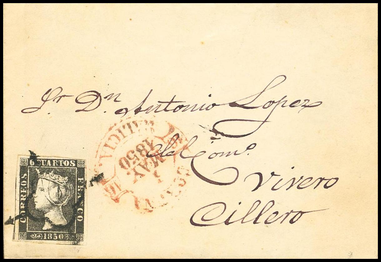1A. 1850. 6 cuartos negro. LA CORUÑA a CILLERO (LUGO). En el frente baeza CORUÑA / GALICIA. MAGNIFICA.