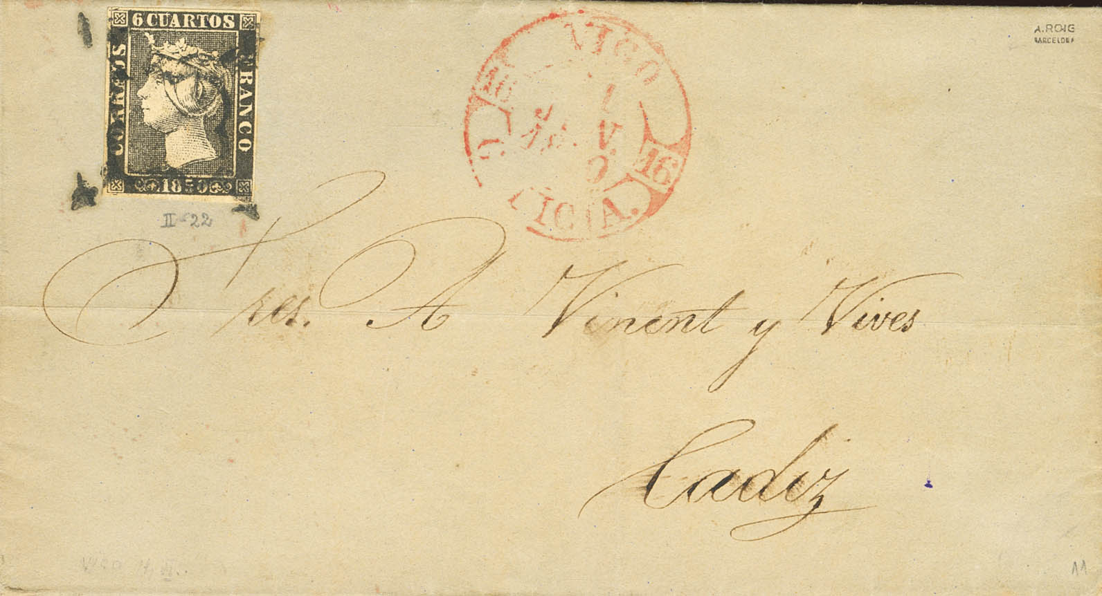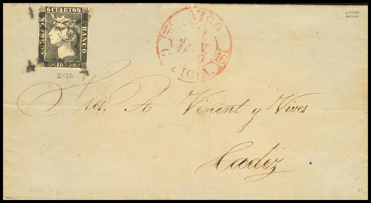 1. 1850. 6 cuartos negro. VIGO a CADIZ. En el frente baeza VIGO / GALICIA. MAGNIFICA.