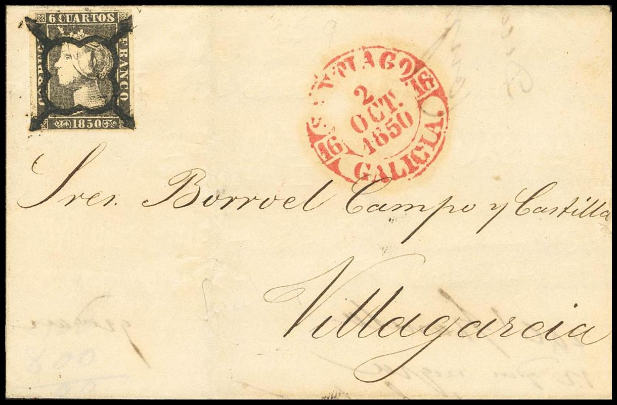 1A. 1850. 6 cuartos negro. SANTIAGO DE COMPOSTELA a VILLAGARCIA DE AROSA. MAGNIFICA.
