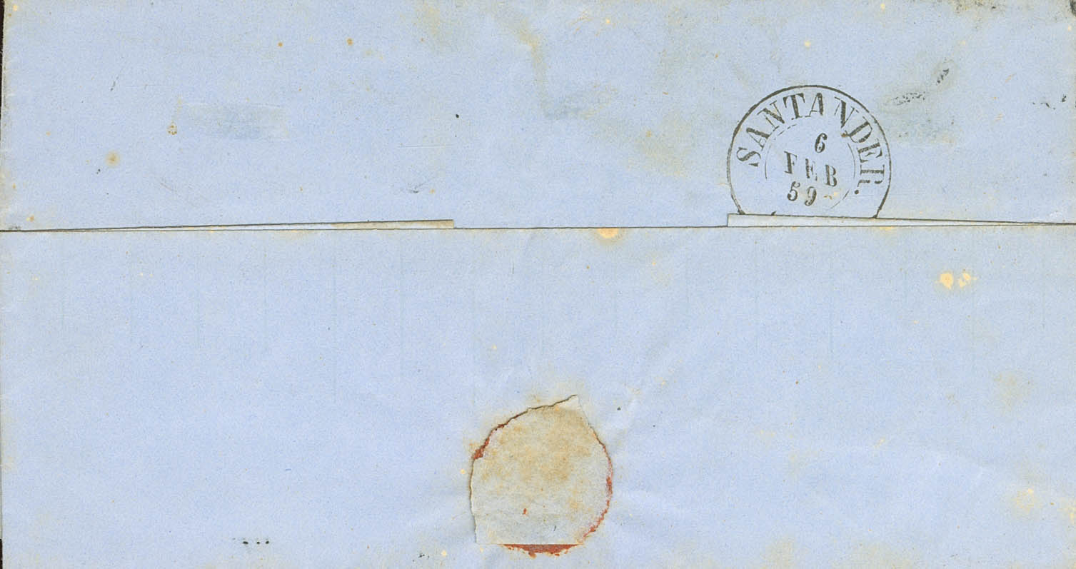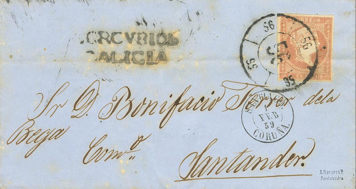 48. 1859. 4 cuartos rojo. FINISTERRE (LA CORUÑA) a SANTANDER. Matasello R.CARRETA Nº56, de Santiago de Compostela y en el frente marca prefilatélica CORCUBION / GALICIA, en negro, ambas aplicadas en tránsito. MAGNIFICA Y MUY RARA.