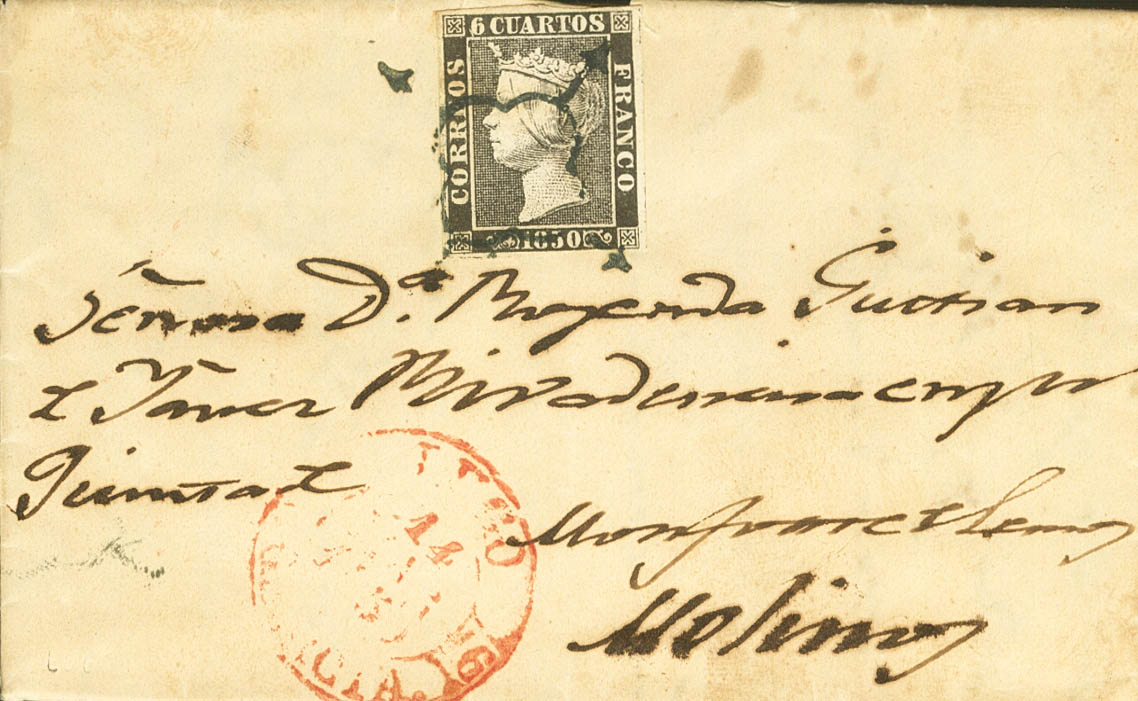 1. 1850. 6 cuartos negro. LUGO a MOLINOS (ORENSE). En el frente baeza LUGO / GALICIA. MAGNIFICA.