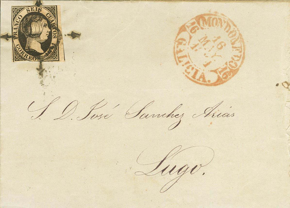 6. 1851. 6 cuartos negro. SARGADELOS (LUGO) a LUGO. En el frente baeza MONDOÑEDO / GALICIA. MAGNIFICA.