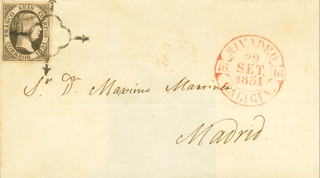 6. 1851. 6 cuartos negro. RIBADEO (LUGO) a MADRID. En el frente baeza RIVADEO / GALICIA. MAGNIFICA.