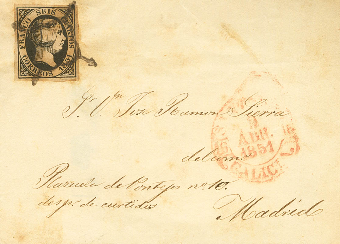 6. 1851. 6 cuartos negro. SANTIAGO DE COMPOSTELA a MADRID. En el frente baeza SANTIAGO / GALICIA. MAGNIFICA.