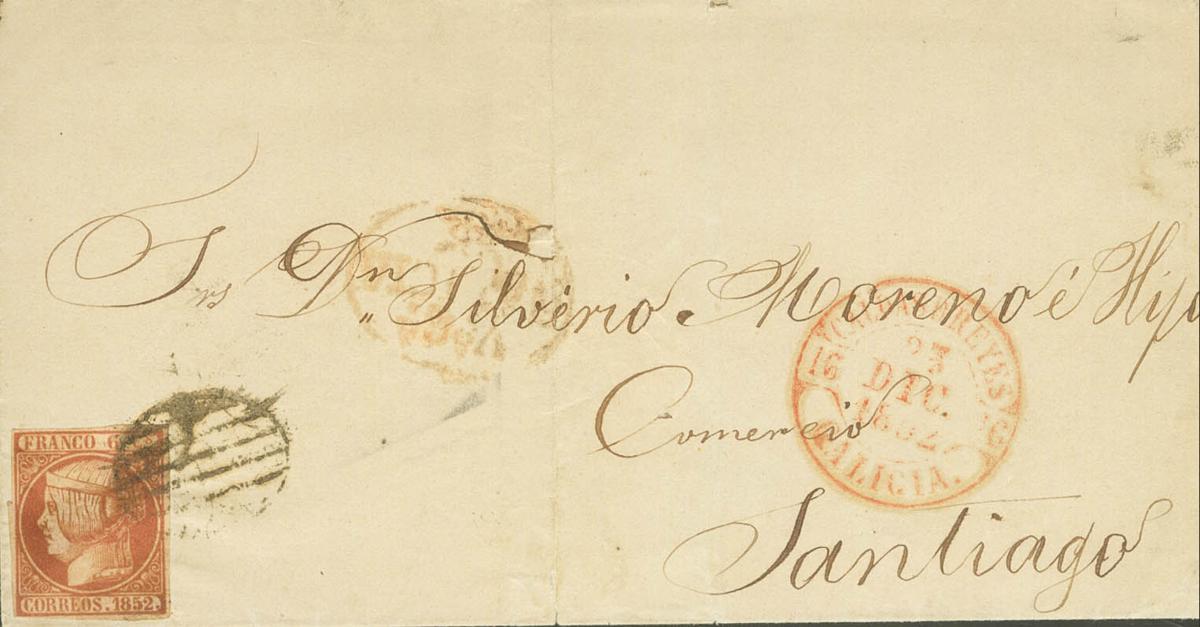 12. 1852. 6 cuartos rosa. Dirigida a SANTIAGO DE COMPOSTELA. En el frente marca prefilatélica Vª Gª / GALICIA y baeza CALDAS D. REYES / GALICIA, ambas en rojo. BONITA Y RARA.