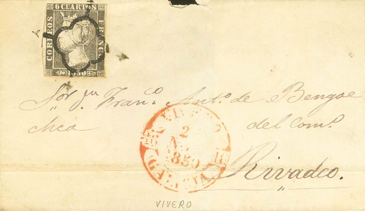 1A. 1850. 6 cuartos negro. VIVERO (LUGO) a RIBADEO. En el frente baeza VIVERO / GALICIA. BONITA.
