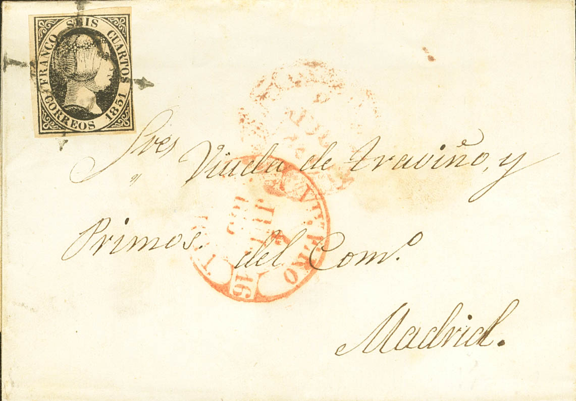 6. 1851. 6 cuartos negro. VIVERO (LUGO) a MADRID. En el frente baeza VIVERO / GALICIA. MAGNIFICA.