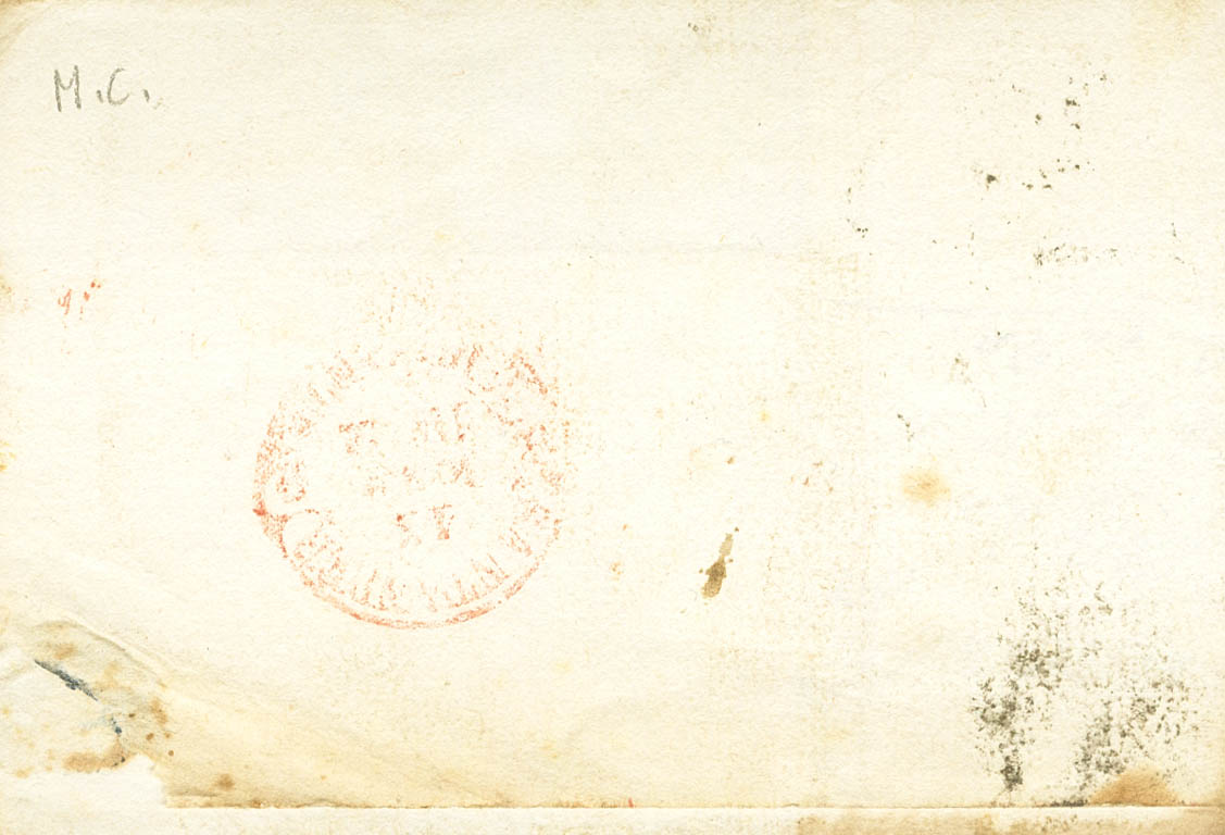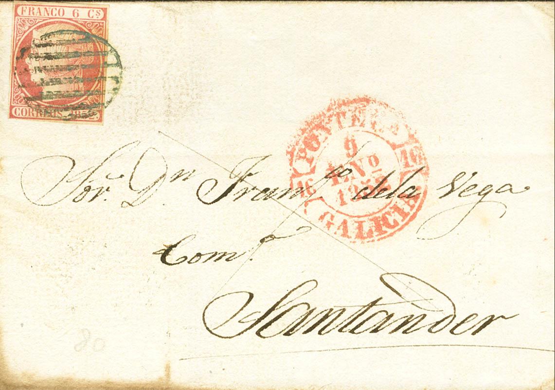 12. 1852. (9 de Enero). 6 cuartos rosa. PONTEVEDRA a SANTANDER. Matasello PARRILLA, en azul y en el frente baeza PONTEVª / GALICIA. MAGNIFICA.