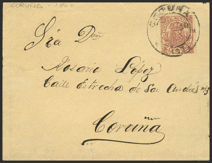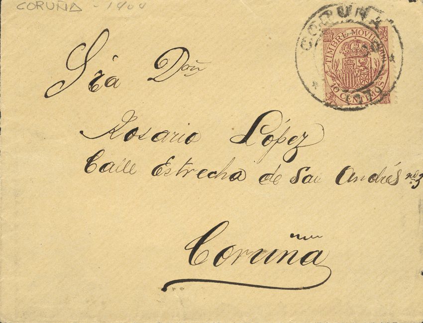Fis 20. 1900. 10 cts castaño MOVIL. Frontal dirigido a CORUÑA. MAGNIFICO.