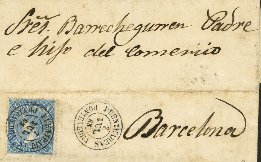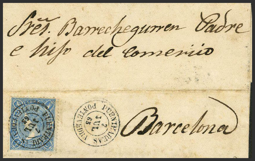 75. 1865. 4 cuartos azul. PUENTEAREAS a BARCELONA. Matasello PUENTEAREAS / PONTEVEDRA. MAGNIFICA.