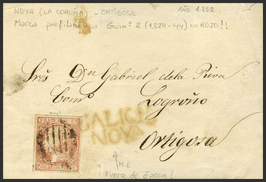 12. 1852. 6 cuartos rosa. NOYA a ORTIGOSA. En el frente marca prefilatélica GALICIA / NOYA. MAGNIFICA.