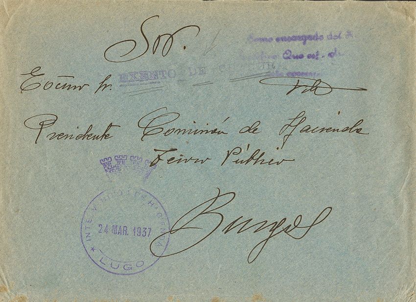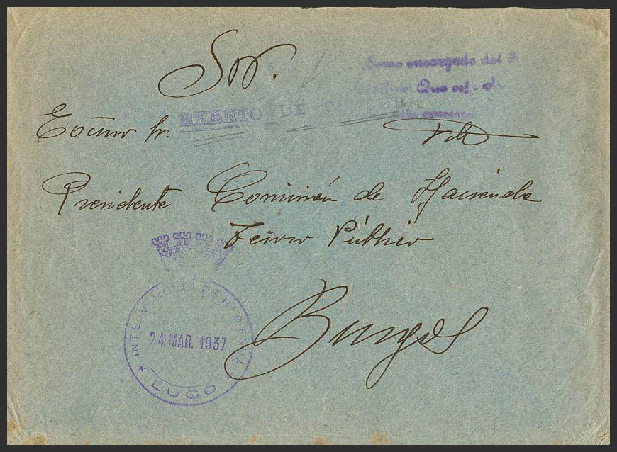 Galicia. Historia Postal. Circulada con franquicia INTERVENCION DE HACIENDA / LUGO. MAGNIFICA.