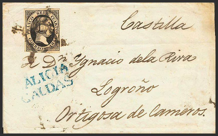 6. 1851. 6 cuartos negro. CALDAS a ORTIGOSA. En el frente marca prefilatélica GALICIA / CALDAS, en azul. MAGNIFICA Y RARA. Cert. COMEX.