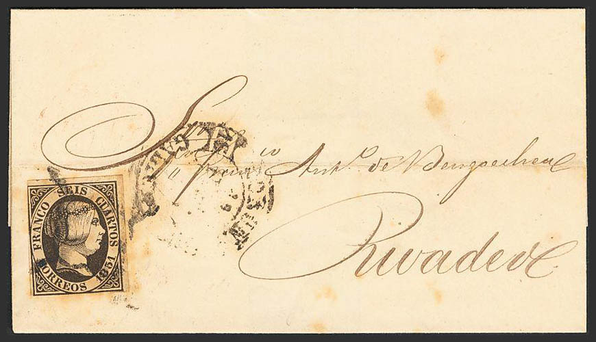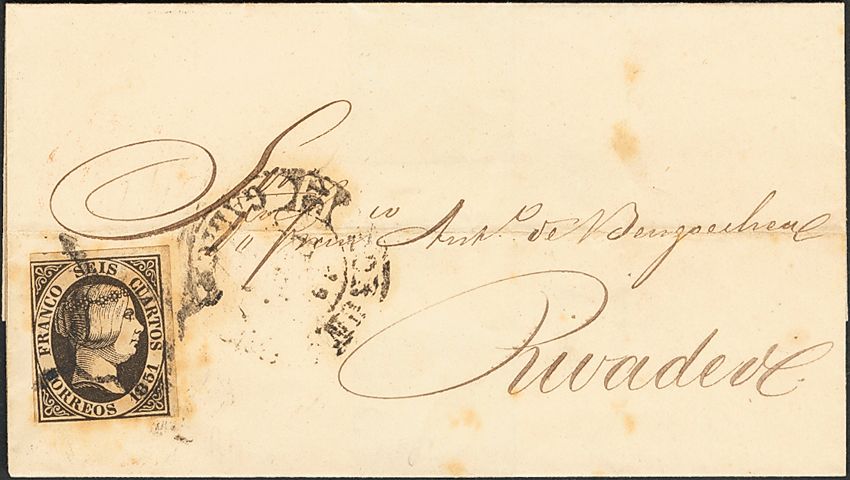 6. 1851. 6 cuartos negro. CORUÑA a RIVADEO. En el frente baeza CORUÑA / GALICIA, en negro. MAGNIFICA Y MUY RARO USO DEL BAEZA EN ESE COLOR.