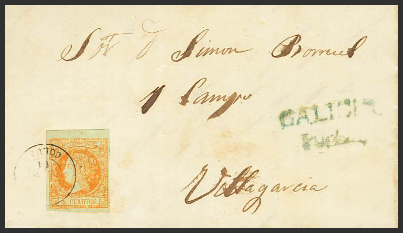 52. 1861. 4 cuartos naranja. SANTA EUGENIA a VILLAGARCIA. En el frente marca prefilatélica GALICIA / PUEBLA. MAGNIFICA.