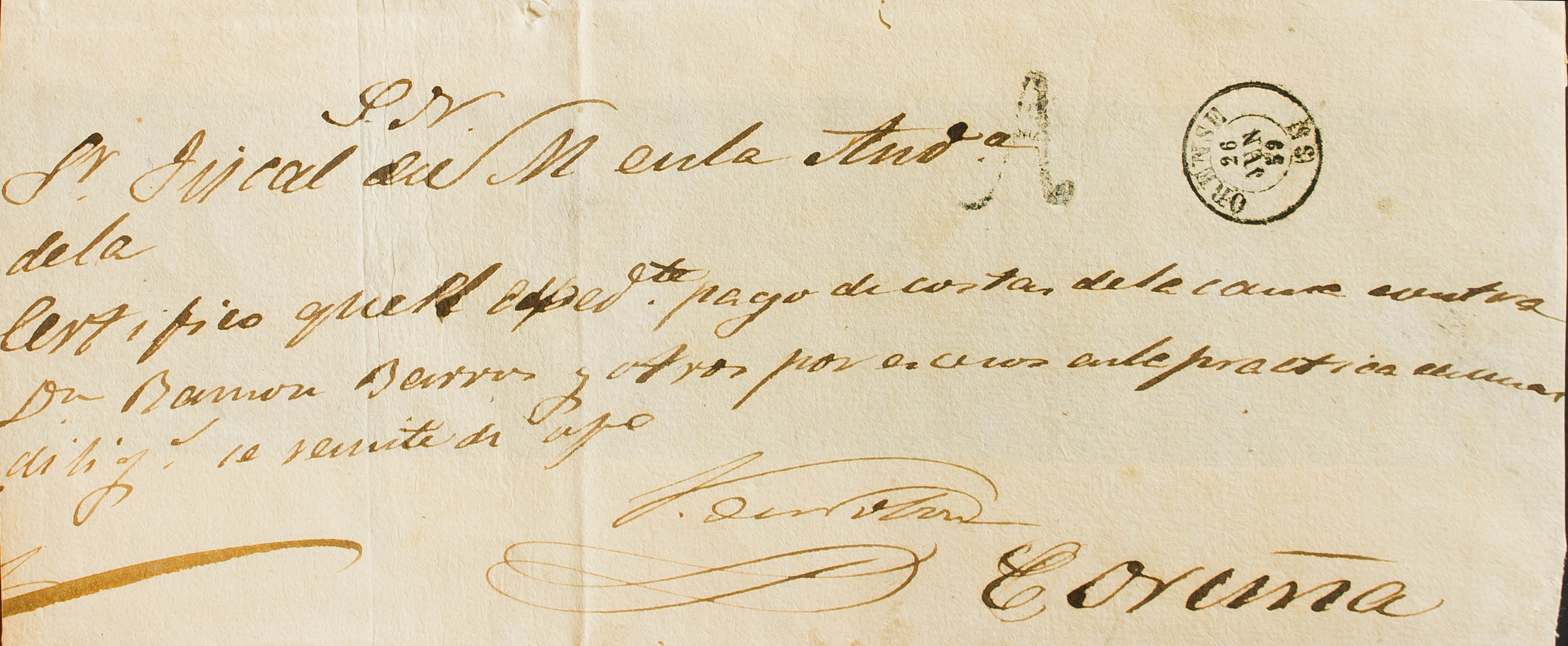 1859. Frente de Plica Judicial de ORENSE a LA CORUÑA. Marca "A", en negro de abono (P.E.20) edición 2004. MAGNIFICA.