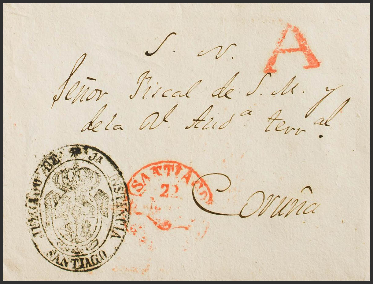 (1846ca). SANTIAGO DE COMPOSTELA a LA CORUÑA. Marca "A", en rojo de abono (P.E.30) edición 2004 y baeza SANTIAGO / GALICIA. MAGNIFICA.