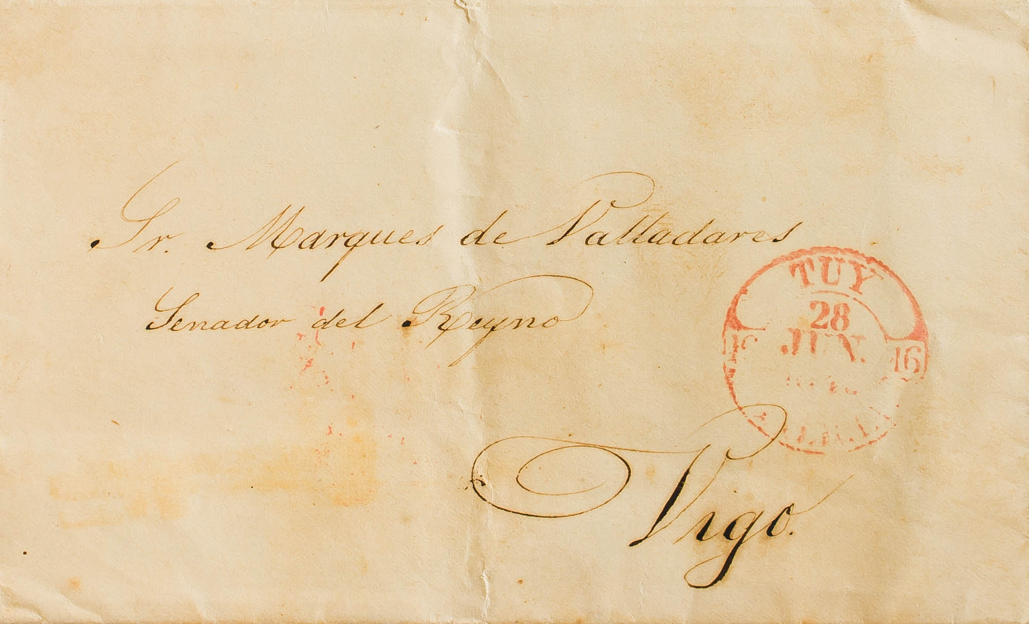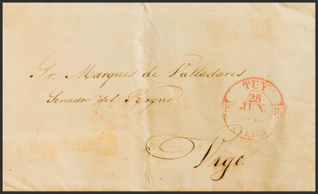 1849. TUY a VIGO. Baeza TUY / GALICIA, en rojo. MAGNIFICA.
