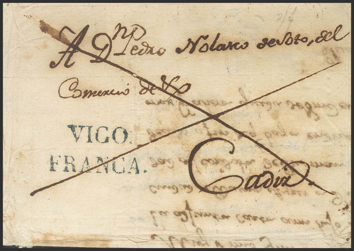 1827. VIGO a CADIZ. Marca VIGO / FRANCA, en azul (ligeramente más pequeña que la reseñada) (P.E.13) edición 2004. MAGNIFICA Y MUY RARA.