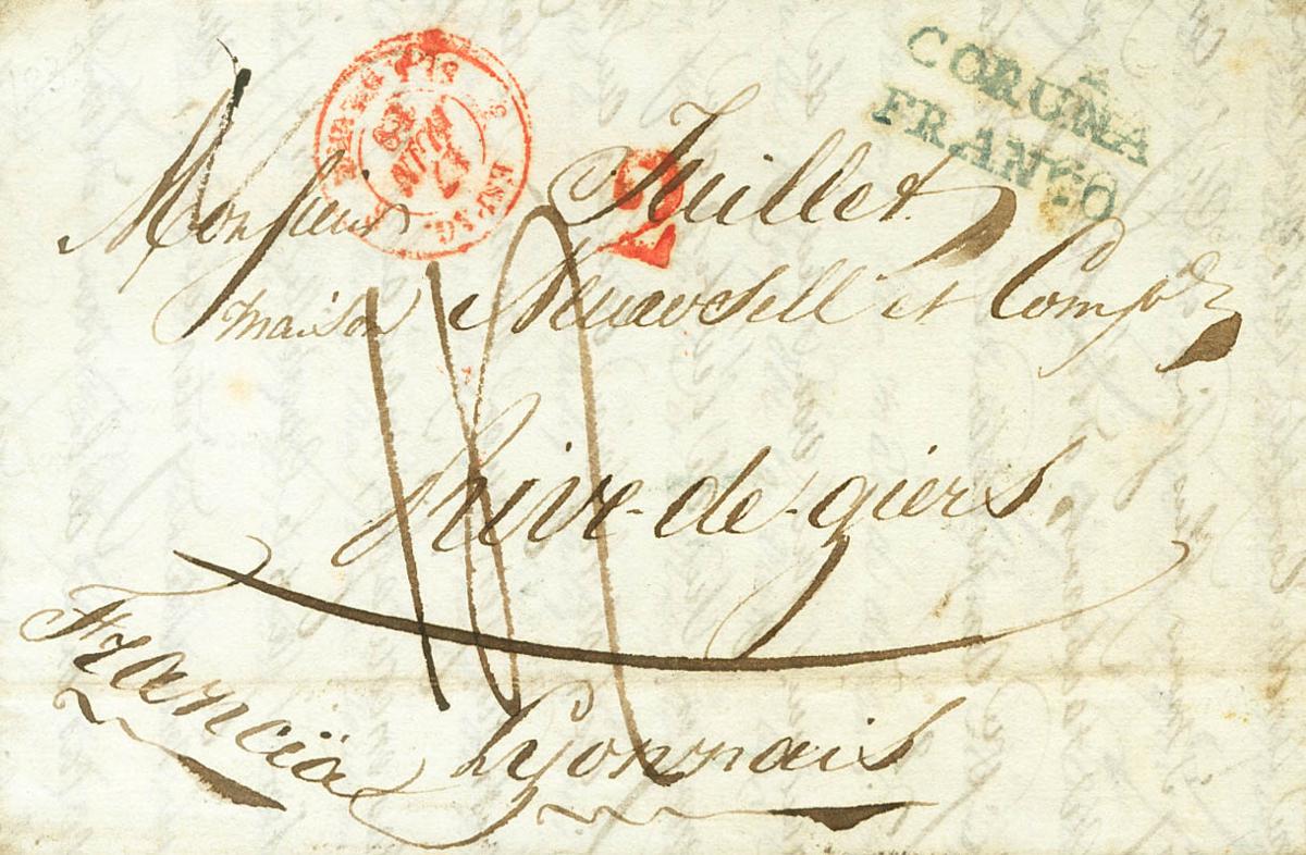 1839. LA CORUÑA a RIVE DE GIER (FRANCIA). Marca CORUÑA / FRANCO, en azul (P.E.17) edición 2004. MAGNIFICA Y RARA.