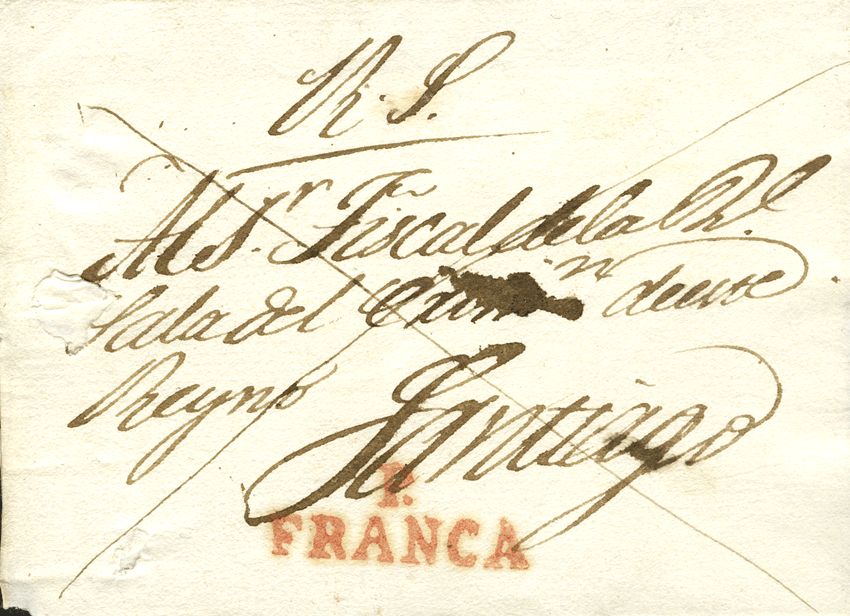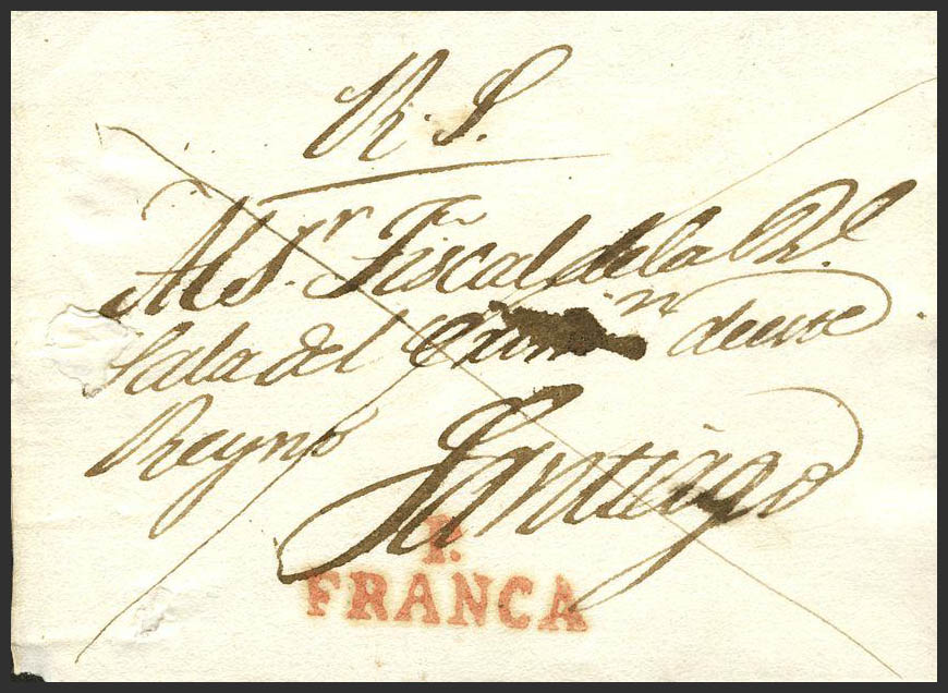 (1825ca). Plica Judicial de PONTEVEDRA a SANTIAGO. Marca P / FRANCA, en rojo (P.E.16) edición 2004. MAGNIFICA Y RARISIMA.