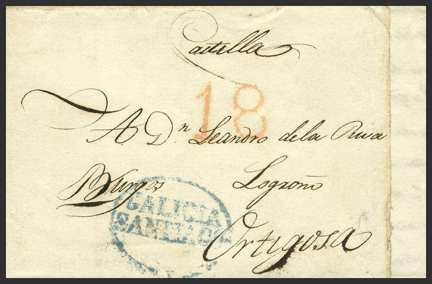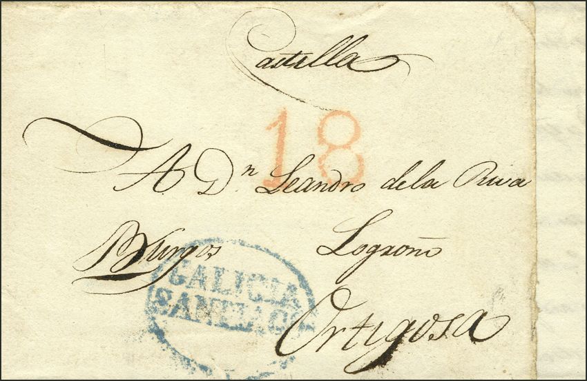 1834. SANTIAGO a ORTIGOSA. Marca GALICIA / SANTIAGO, en azul (P.E.18) edición 2004. MAGNIFICA Y RARA.