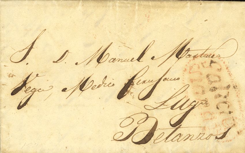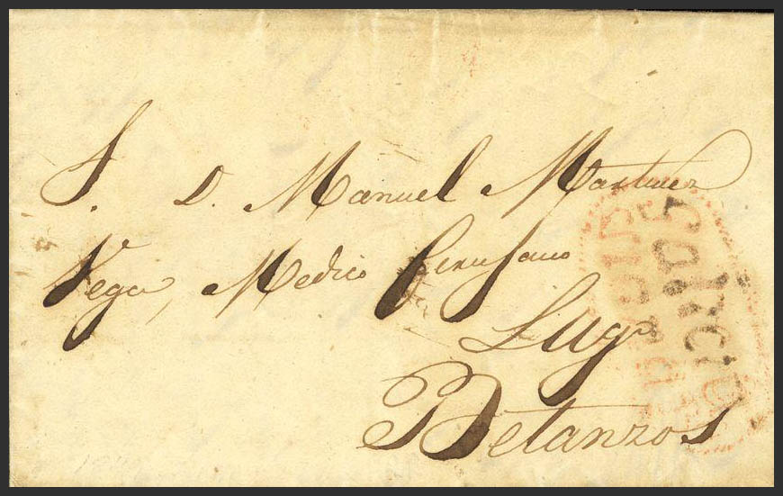 1849. VIANA DEL BOLLO a BETANZOS. Marca GALICIA / VIANA Bº, en rojo (P.E.1) edición 2004. MAGNIFICA Y RARA.