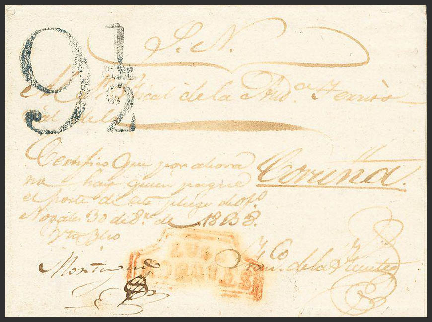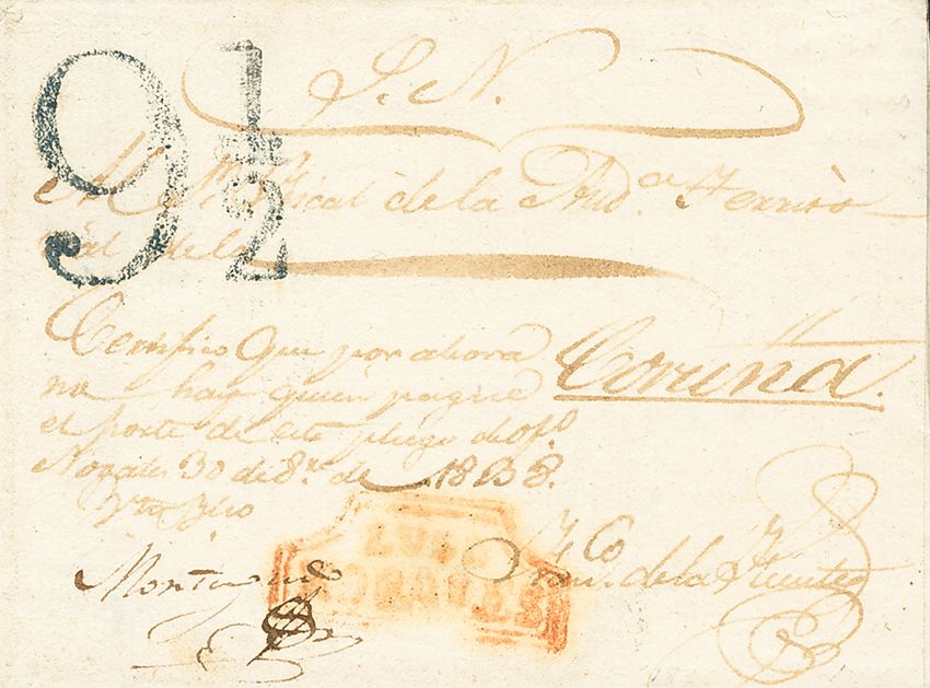 1838. Plica Judicial de NOGALES a CORUÑA. Marca LUGO / NOGALES (P.E.1) edición 2004. MAGNIFICA Y MUY RARA.