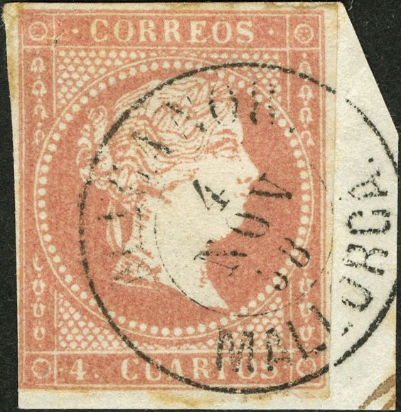 △ 48. 1856. 4 cuartos rojo, sobre fragmento. Matasello MACANOR / MALLORCA. MAGNIFICO.